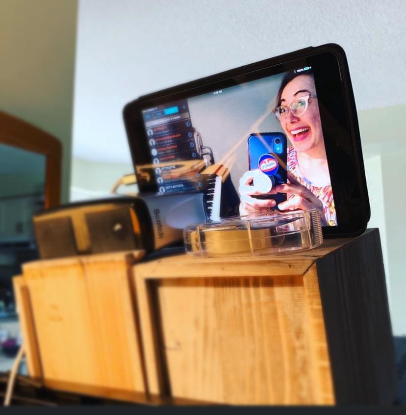 It looks like a giant screen was on a credenza – or furniture made for cats, but I actually balanced two wooden tissue boxes onto a music stand and tilted the stand towards the piano, with tape dispensers to prevent my iPaid from tipping forward. A week after using my iPad, it stopped accepting FaceTime and only my iPhone did, and that turned out well, but I still had the issue of balancing the phone the way I needed to.